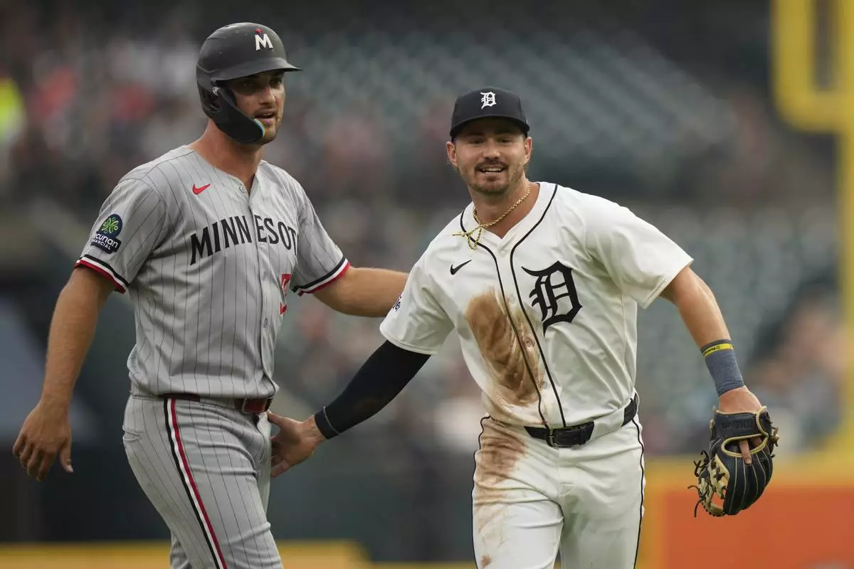 Detroit Tigers shortstop Zach McKinstry, right, and Minnesota Twins' Matt Wallner react while walking off the field during the fourth inning of a baseball game, Monday, Aug. 4, 2025, in Detroit. (AP Photo/Ryan Sun)