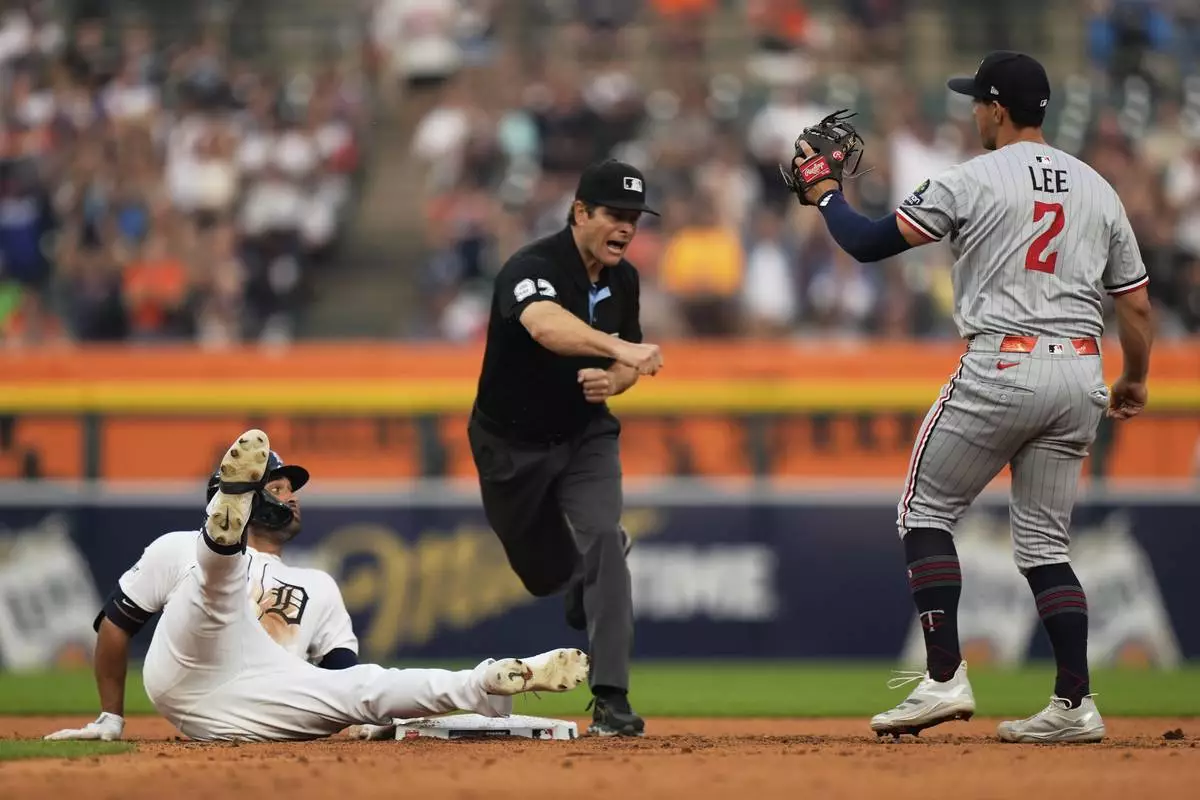 Detroit Tigers designated hitter Riley Greene, left, is called out at second base by umpire Ben May, center, as Minnesota Twins shortstop Brooks Lee (2) watches during the sixth inning of a baseball game, Monday, Aug. 4, 2025, in Detroit. (AP Photo/Ryan Sun)