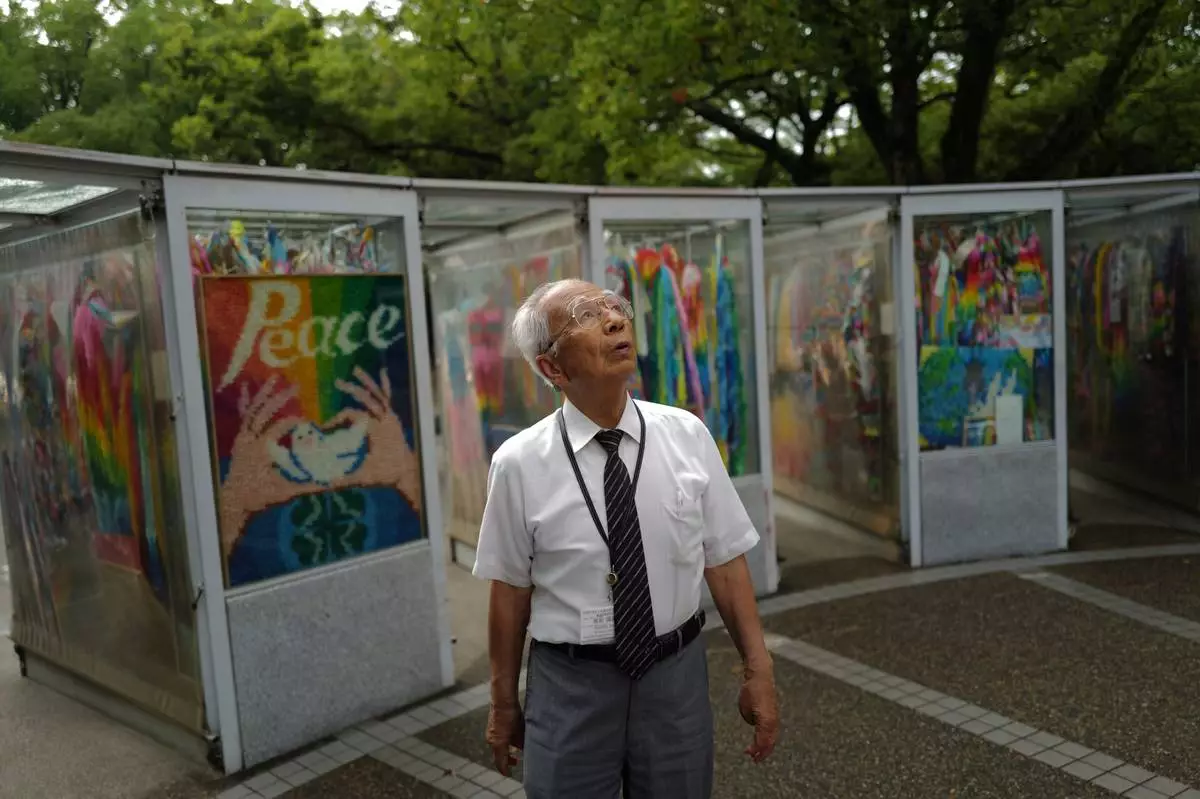 Kunihio Iida, atomic bomb survivor and a volunteer guide speaks in English to foreign visitors looks app the sky in front of the Children's Peace Monument where the place where people offer paper cranes to honor the victims of the 1945 atomic bomb on Wednesday, July 9, 2025, in Hiroshima, western Japan. (AP Photo/Eugene Hoshiko)
