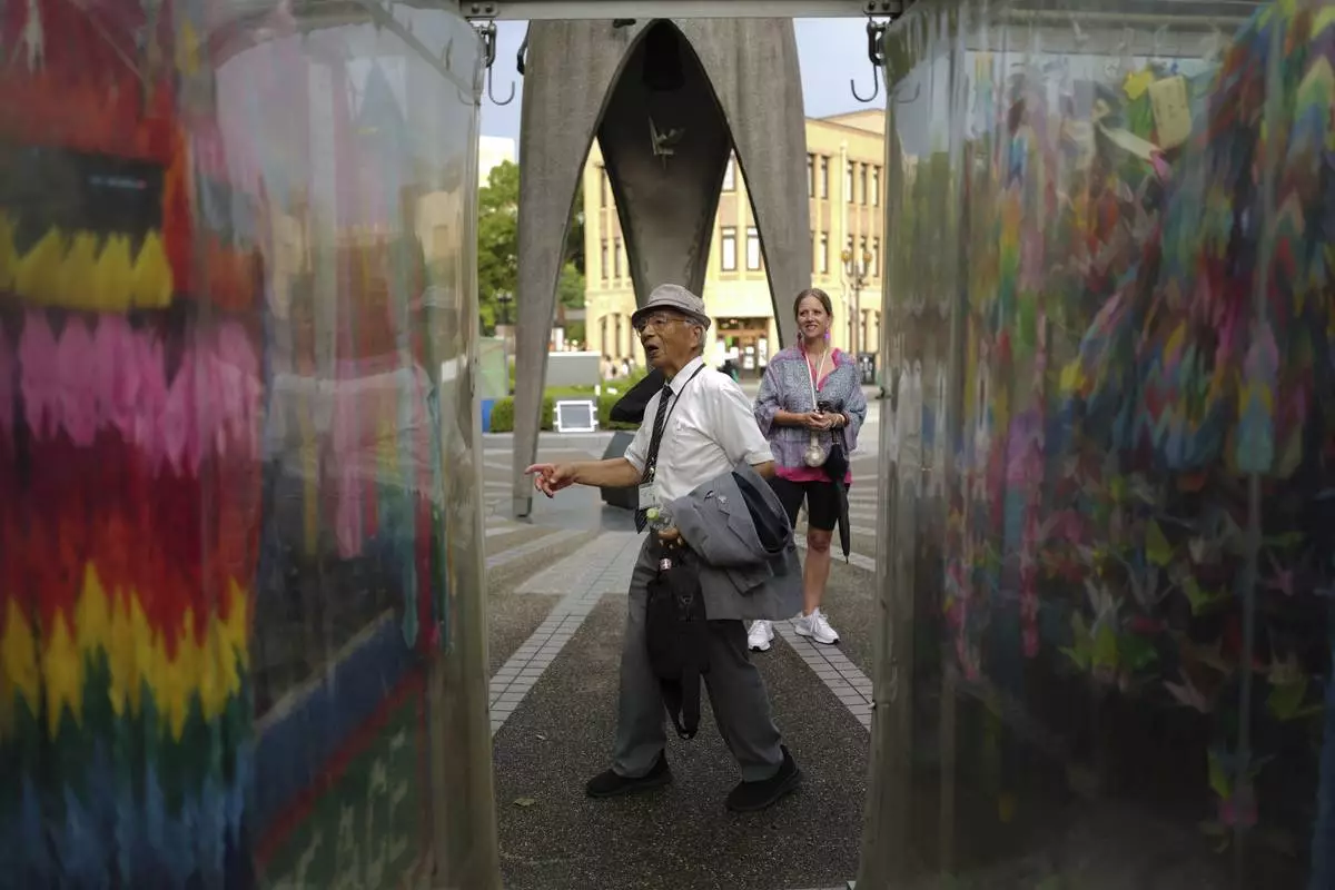 Kunihio Iida, atomic bomb survivor and a volunteer guide speaks in English to foreign visitors at the Children's Peace Monument where the place where people offer paper cranes to honor the victims of the 1945 atomic bomb on Wednesday, July 9, 2025, in Hiroshima, western Japan. (AP Photo/Eugene Hoshiko)