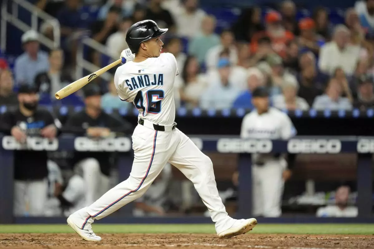 Miami Marlins' Javier Sanoja hits a home run in the seventh inning of a baseball game against the Houston Astros, Monday, Aug. 4, 2025, in Miami. (AP Photo/Rebecca Blackwell)