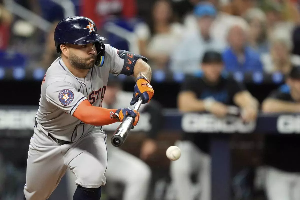 Houston Astros' Jose Altuve bunts for a single, in the fourth inning of a baseball game against the Miami Marlins, Monday, Aug. 4, 2025, in Miami. (AP Photo/Rebecca Blackwell)