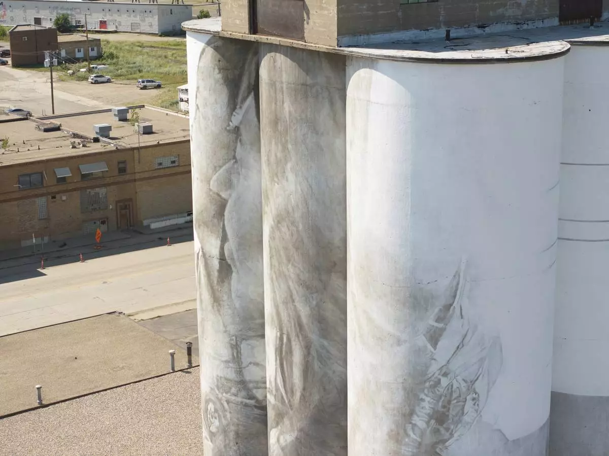 MINOT, N.D. (AP) — High atop a massive grain elevator in the middle of Minot, North Dakota, artist Guido van Helten swipes a concrete wall with a brush that looks more appropriate for painting a fence than creating a monumental mural.
