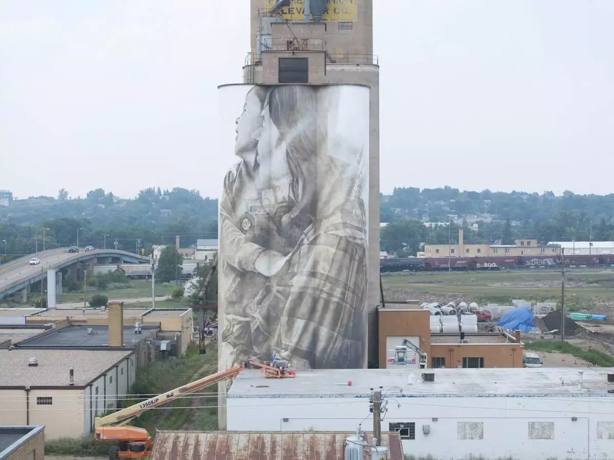 The work on the former Union Silos is van Helten's latest effort to paint murals on a gigantic scale, with earlier projects on structures ranging from a dam in Australia to part of a former cooling tower at the Chernobyl nuclear plant in Ukraine. Although he has created murals throughout the world, grain silos in the U.S. Midwest have been among his most frequent sites.