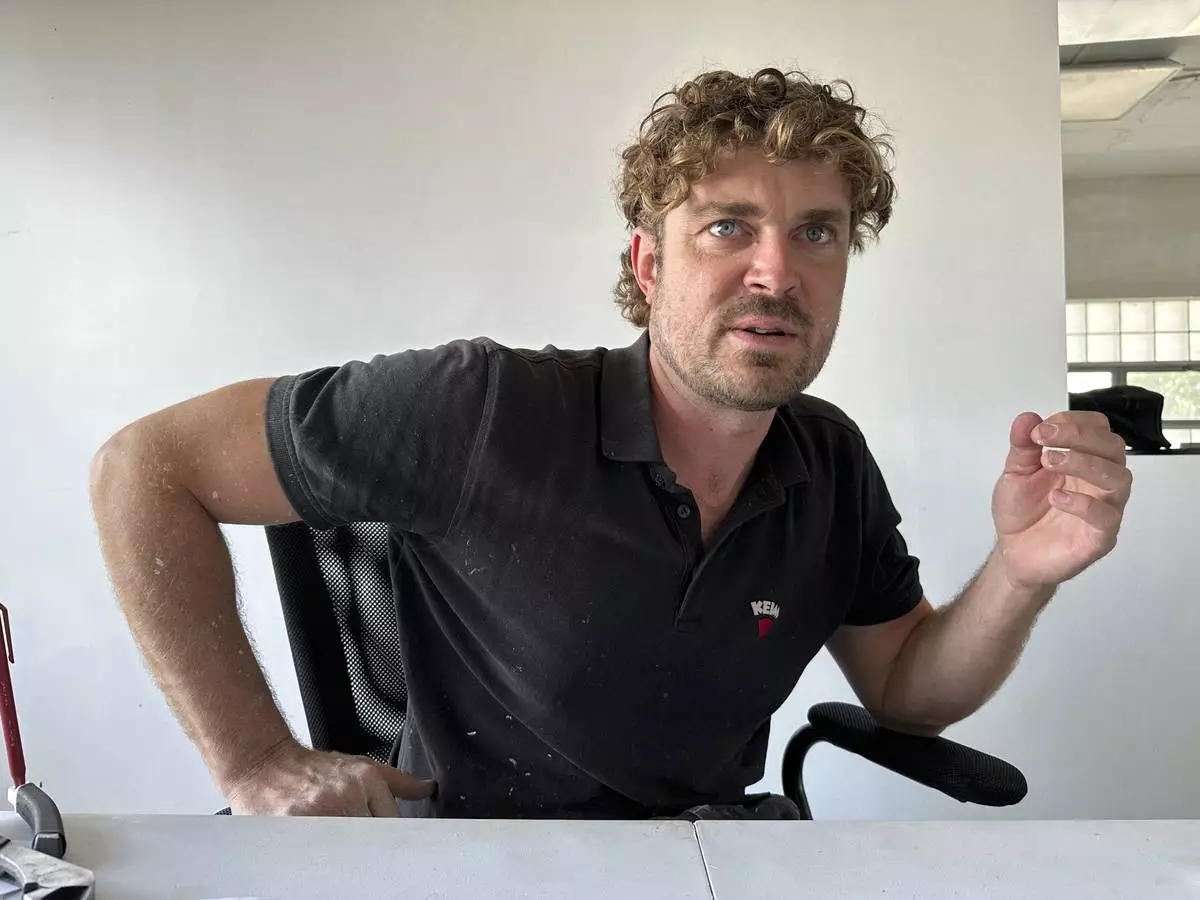 Artist Guido van Helten discusses his murals on Monday, July 14, 2025, in Minot, N.D. (AP Photo/Jack Dura)