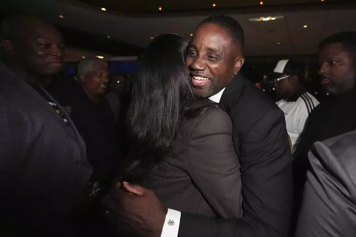 Detroit mayoral candidate Solomon Kinloch Jr. hugs supporters at a campaign watch party Tuesday, Aug. 5, 2025, in Detroit. (AP Photo/Ryan Sun)
