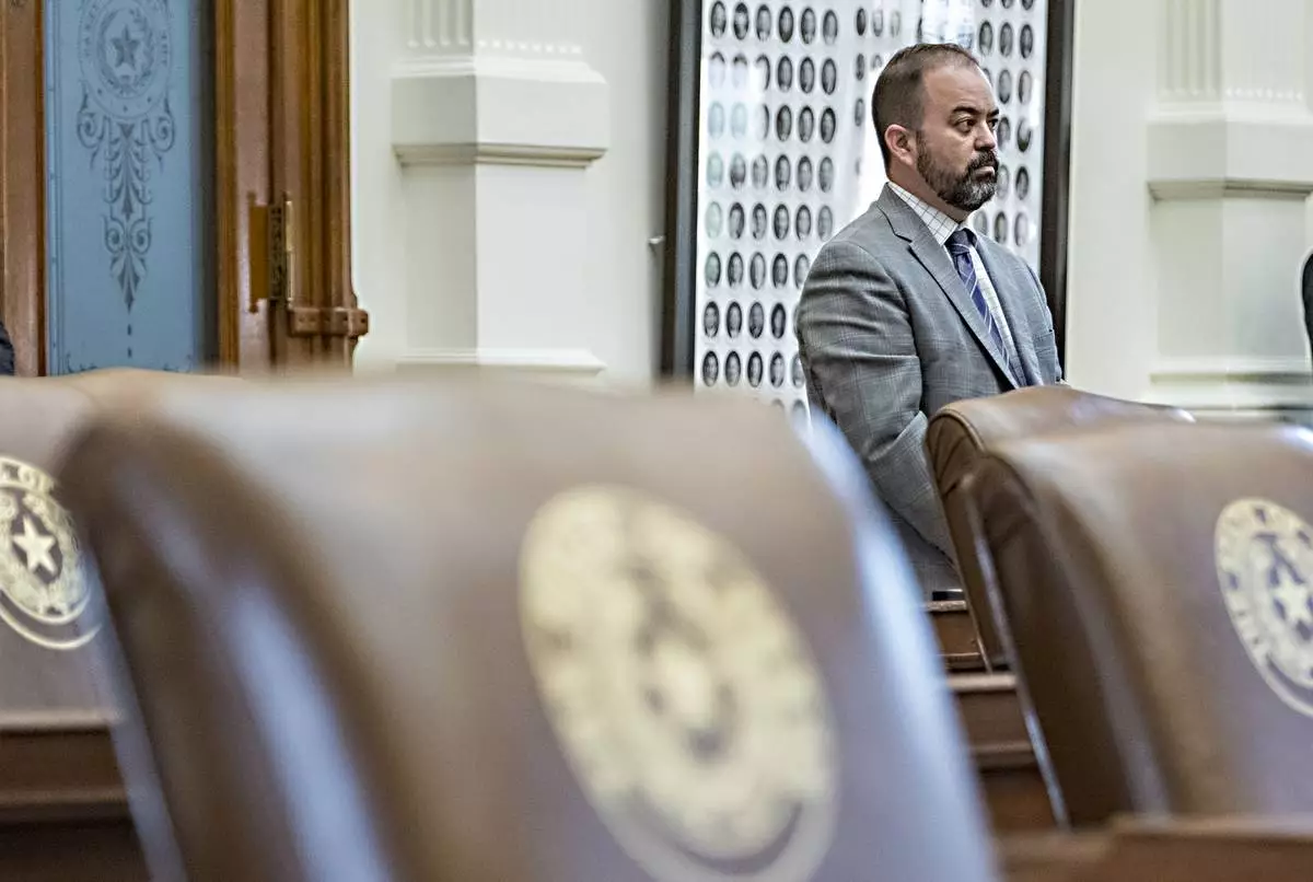 Texas House Rep. Daniel Alders, R - Tyler, stands at his desk during with empty chairs belonging to House Democrats remain empty in the State Capitol, Tuesday, Aug. 5, 2025, in Austin, Texas. (AP Photo/Rodolfo Gonzalez)