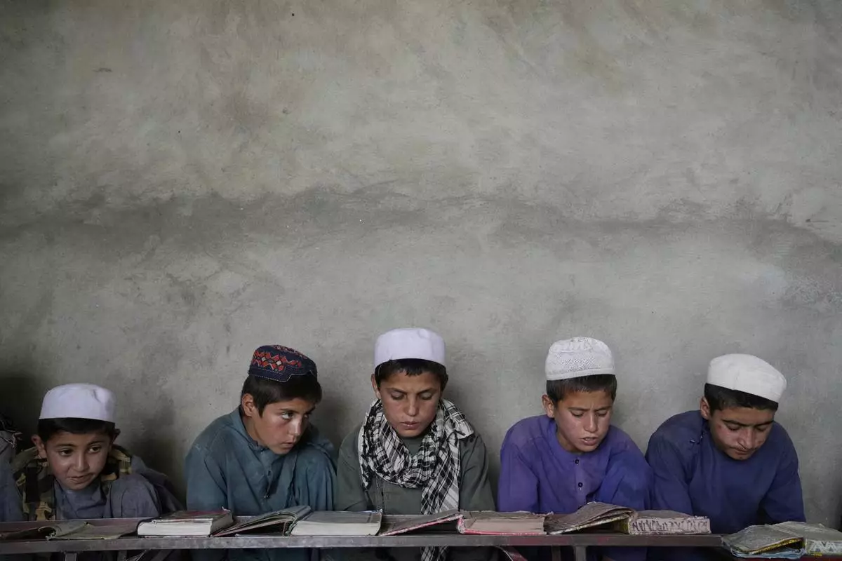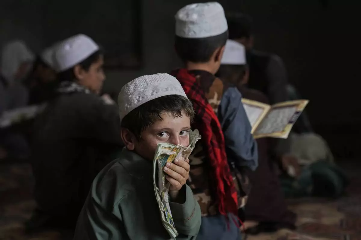 An Afghan boy glances at the camera during a Quran class at the Abdullah Ibn-Masoud religious school on the outskirts of Kabul, Afghanistan, Monday, May 26, 2025. (AP Photo/Ebrahim Noroozi)