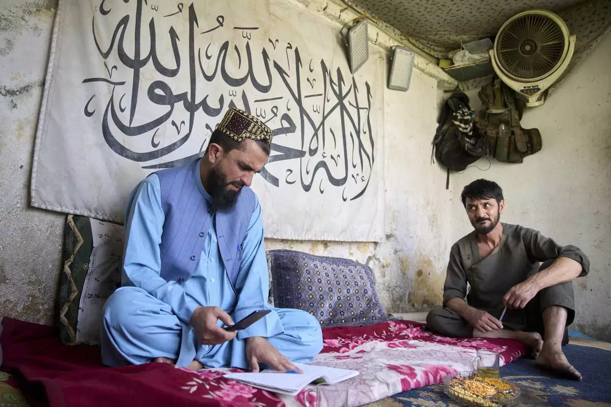 Qari Hizbollah, director of the Imam al-Tirmidhi religious boarding school, left, works with a local baker to count loaves of bread purchased for the school in Kabul, Afghanistan, Wednesday, June 11, 2025. (AP Photo/Ebrahim Noroozi)
