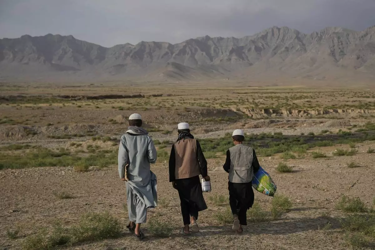Afghan boys walk back to the Abdullah Ibn-Masoud religious school where they live after collecting food aid from nearby villages in the outskirts of Kabul, Afghanistan, Monday, May 26, 2025. (AP Photo/Ebrahim Noroozi)