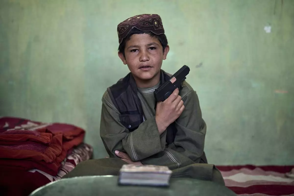An Afghan boy poses for a photo with his toy pistol at the Imam al-Tirmidhi religious school in Kabul, Afghanistan, Wednesday, June 11, 2025. (AP Photo/Ebrahim Noroozi)