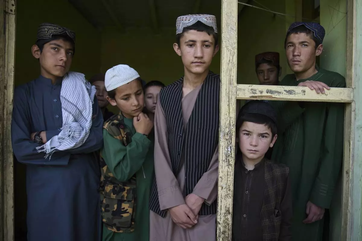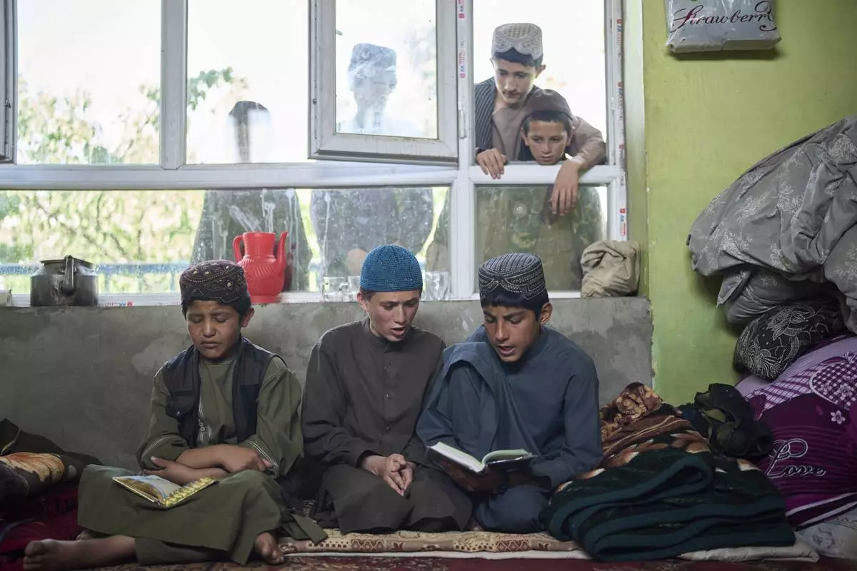 Afghan boys living at the Imam al-Tirmidhi religious school stand by a window frame inside their school in Kabul, Afghanistan, Wednesday, June 11, 2025. (AP Photo/Ebrahim Noroozi)