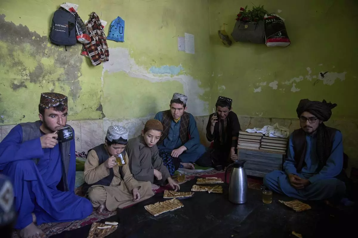 Afghan boys living at the Imam al-Tirmidhi religious school eat bread and tea for breakfast in Kabul, Afghanistan, Wednesday, June 11, 2025. (AP Photo/Ebrahim Noroozi)