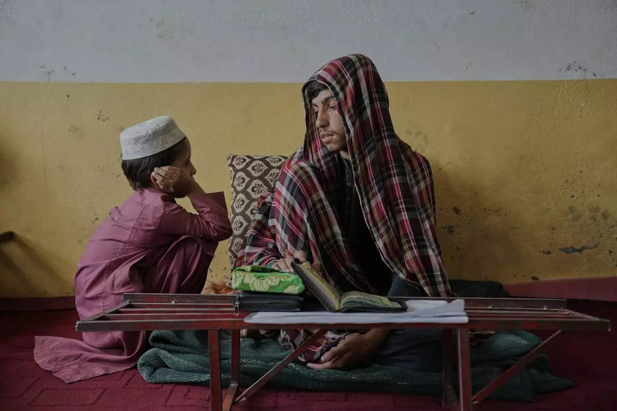 A religious studies teacher instructs a boy in Quran recitation at the Abdullah Ibn-Masoud religious school on the outskirts of Kabul, Afghanistan, Monday, May 26, 2025. (AP Photo/Ebrahim Noroozi)