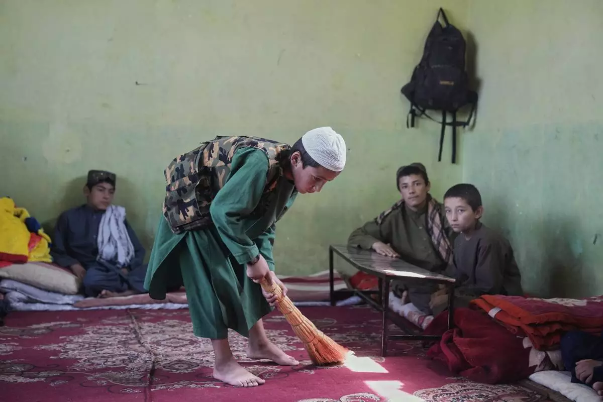 An Afghan boy sweeps the room where he lives and studies at the Imam al-Tirmidhi religious school in Kabul, Afghanistan, Wednesday, June 11, 2025. (AP Photo/Ebrahim Noroozi)
