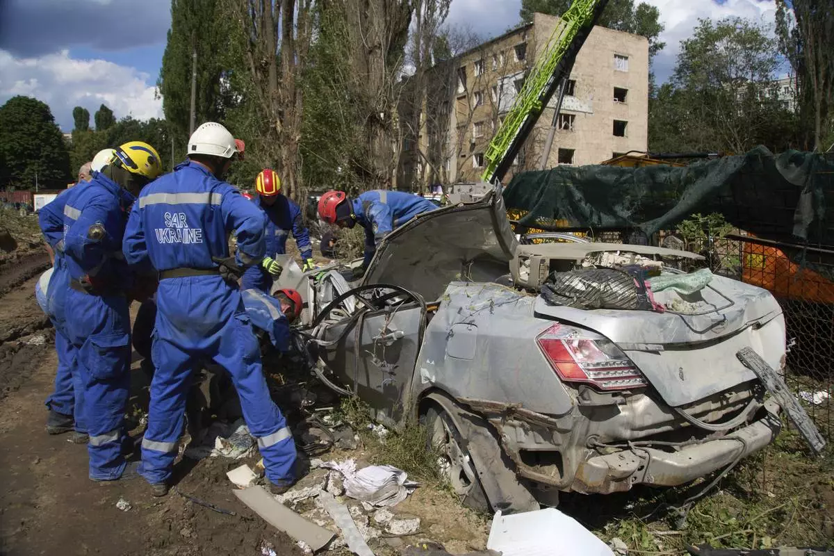 Emergency workers inspect a damaged car close to the multi-storey residential house that was ruined by a Russian missile Thursday night, killing 31 civilians including five children, in Kyiv, Ukraine, Friday, Aug. 1, 2025. (AP Photo/Efrem Lukatsky)