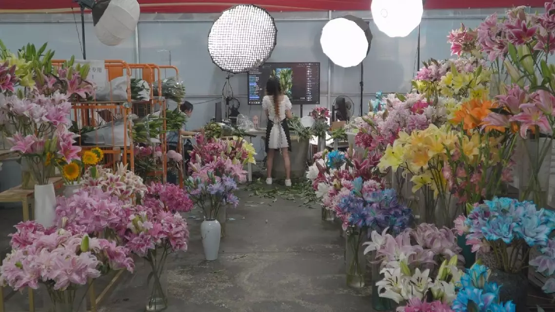 On camera, hosts showcase seasonal blooms like lilies, while behind them, workers swiftly trim, hydrate, and pack the flowers. Orders are then shipped nationwide via cold-chain logistics or air freight, with deliveries reaching customers in as little as 48 hours.
