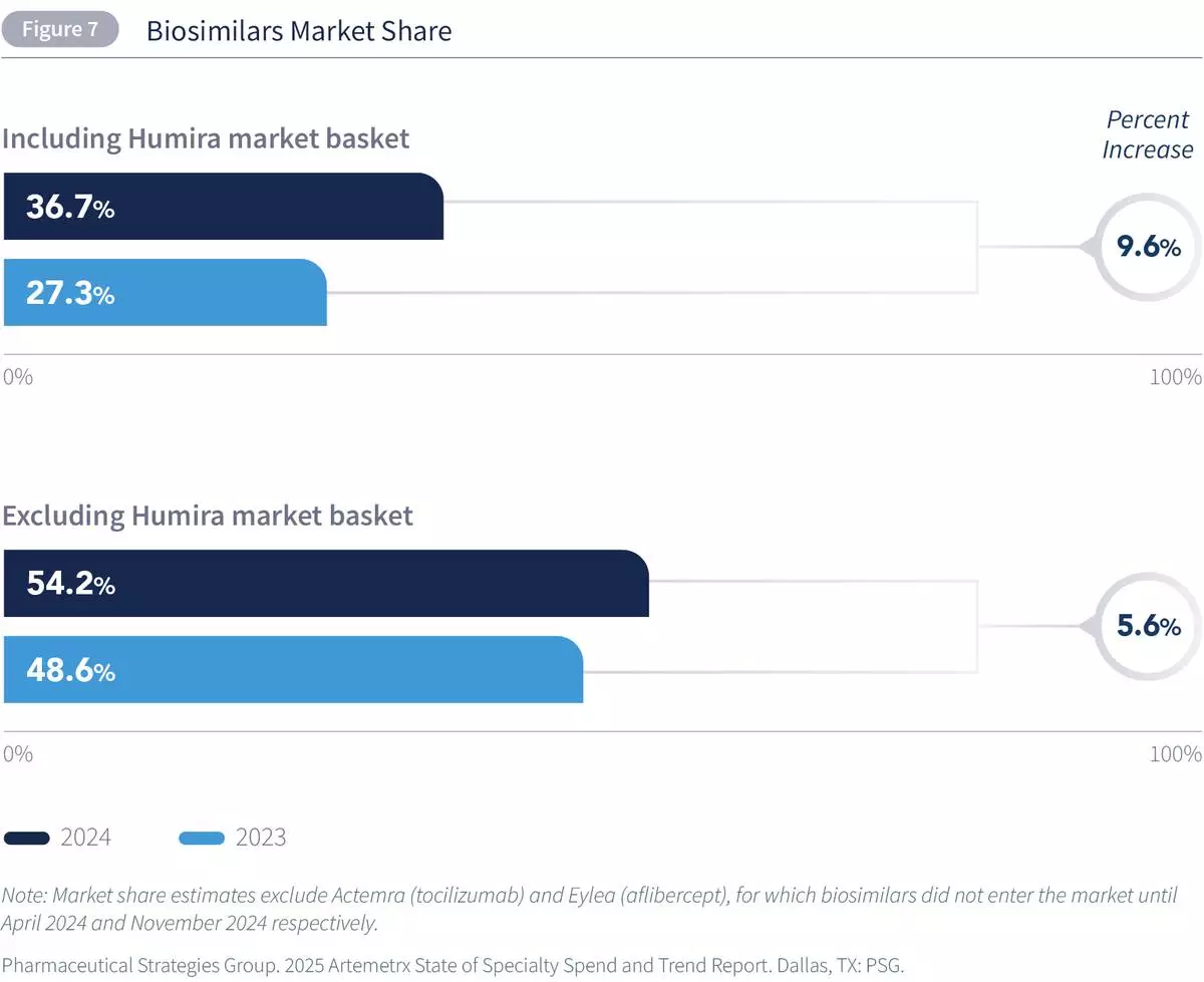 Annual spending on specialty drugs continues to increase but at a slower pace than prior years, driven in part by biosimilar adoption.