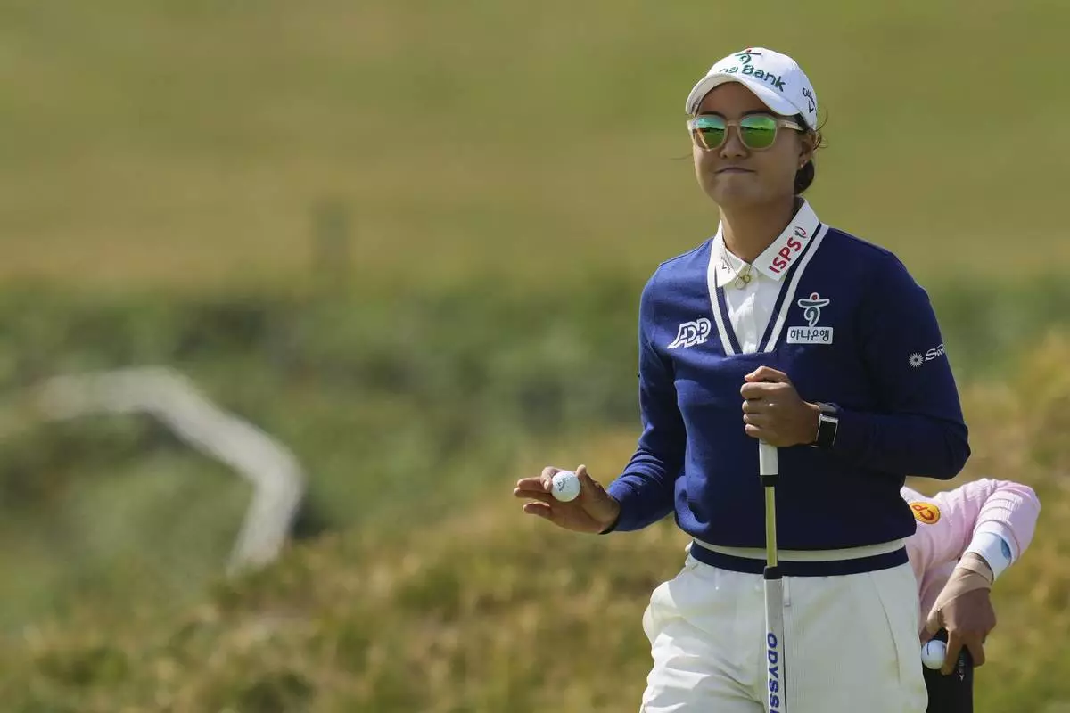 Minjee Lee of Australia reacts on the 6th green during the second round of the Women's British Open golf championship, at Royal Porthcawl Golf Club in Porthcawl, Wales, Friday, Aug. 1, 2025. (AP Photo/Kin Cheung)