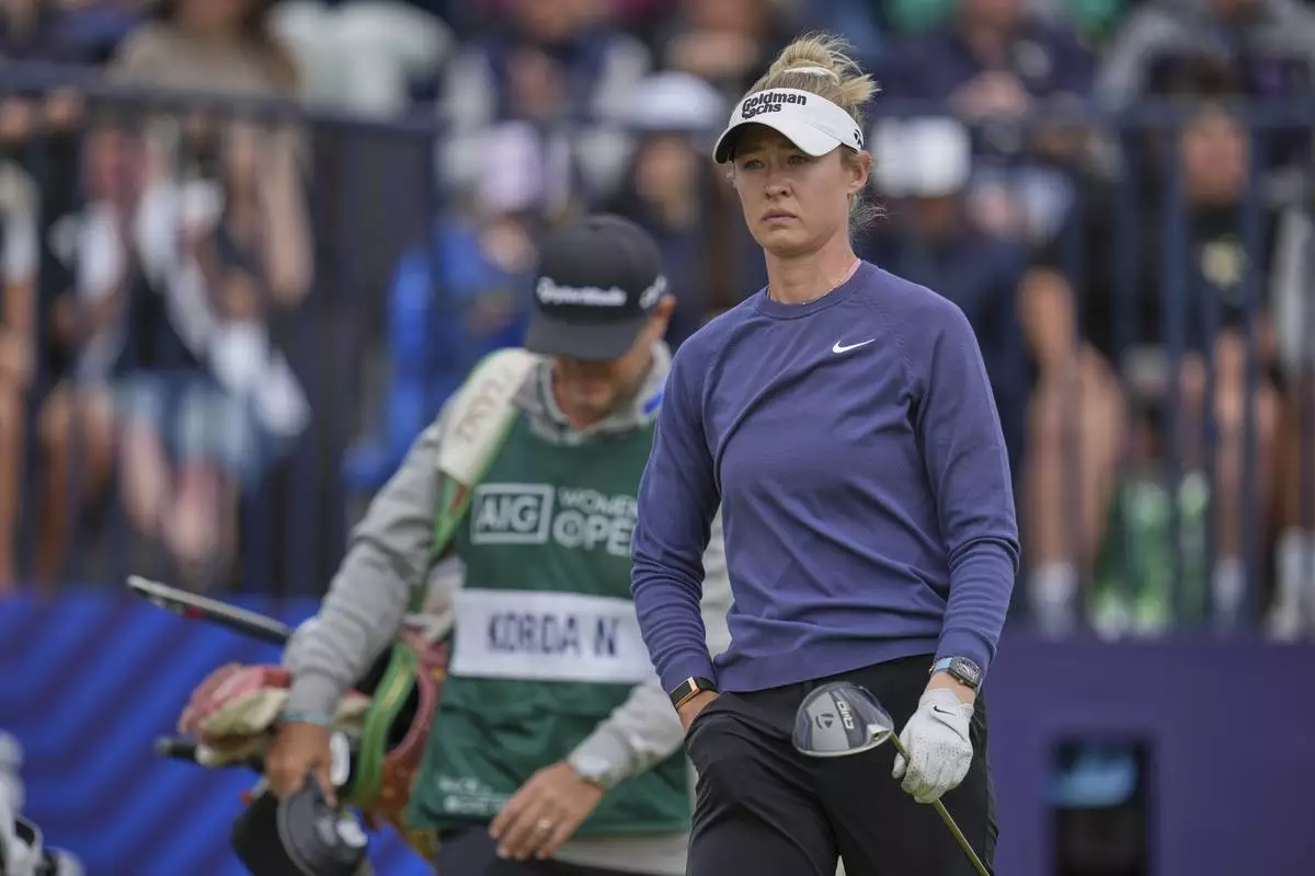 Nelly Korda of the United States walks from the 1st tee during the third round of the Women's British Open golf championship, at Royal Porthcawl Golf Club in Porthcawl, Wales, Saturday, Aug. 2, 2025. (AP Photo/Kin Cheung)