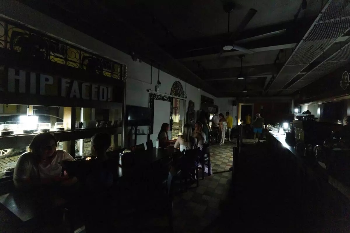FILE - Customers sit inside a restaurant lit by battery-powered lanterns during an island-wide power outage, in Old San Juan, Puerto Rico, April 16, 2025. (AP Photo/Alejandro Granadillo, File)