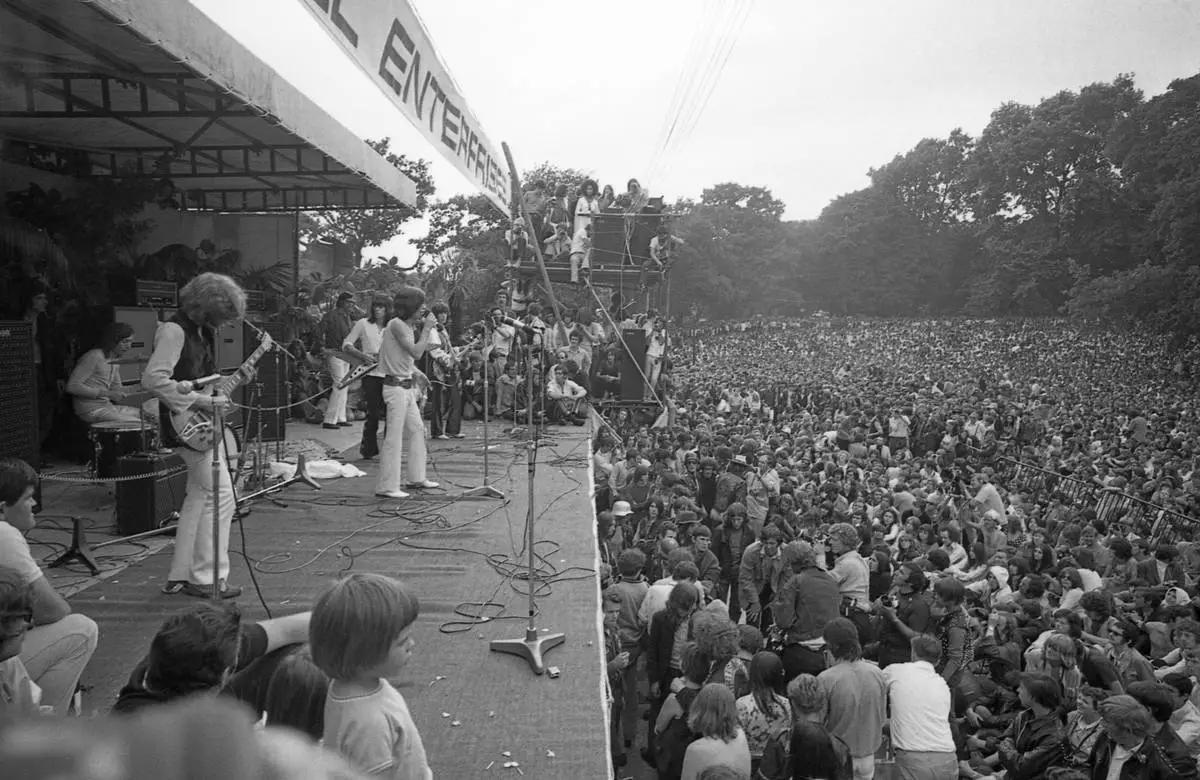 FILE - Mick Jagger, Mick Taylor, Charlie Watts, Keith Richards and Bill Wyman of The Rolling Stones perform before a crowd of nearly 250,000 fans in Hyde Park, London, on July 5, 1969, during a five hour concert. (AP Photo/Peter Kemp, File)