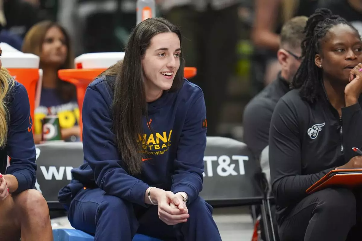 Indiana Fever guard Caitlin Clark looks on from the bench during the first half of a WNBA basketball game against the Dallas Wings Friday, Aug. 1, 2025, in Dallas. (AP Photo/Julio Cortez)