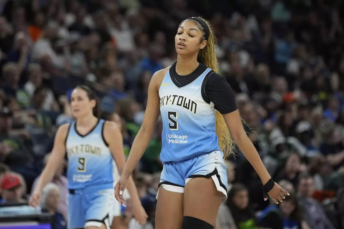 Chicago Sky forward Angel Reese (5) reacts after receiving a traveling violation during the first half of a WNBA basketball game against the Minnesota Lynx Tuesday, July 22, 2025, in Minneapolis. (AP Photo/Abbie Parr)