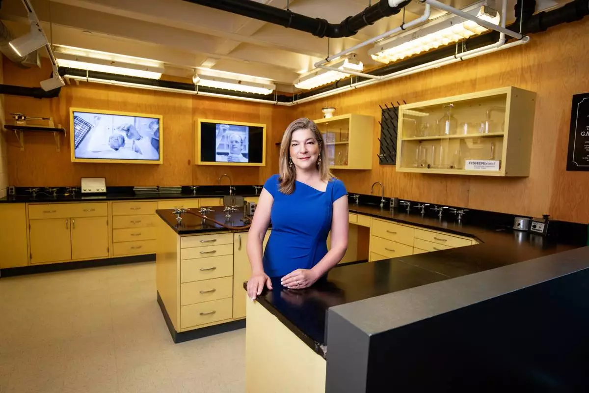 Phoebe Cade Miles in the Cade Museum's replica of her father's lab where he led the team that invented Gatorade at the University of Florida in 1965.