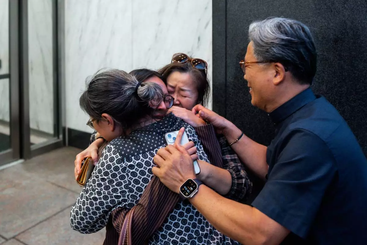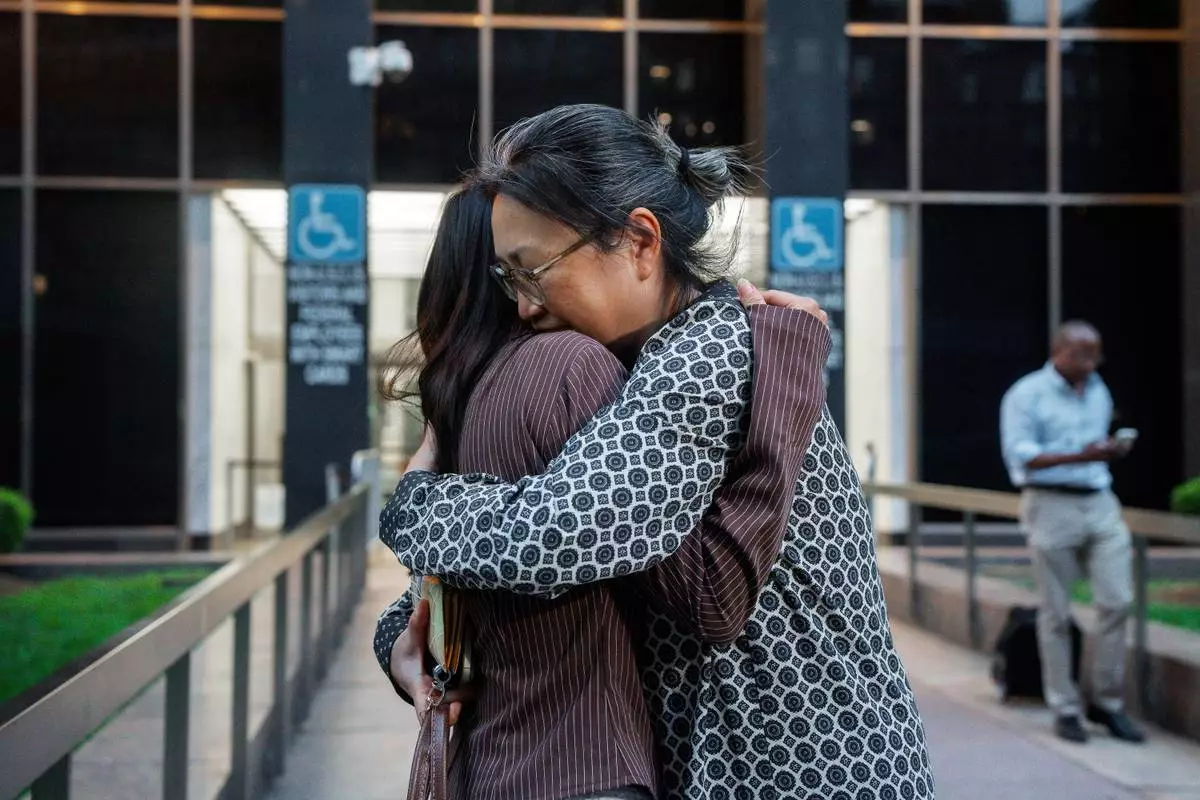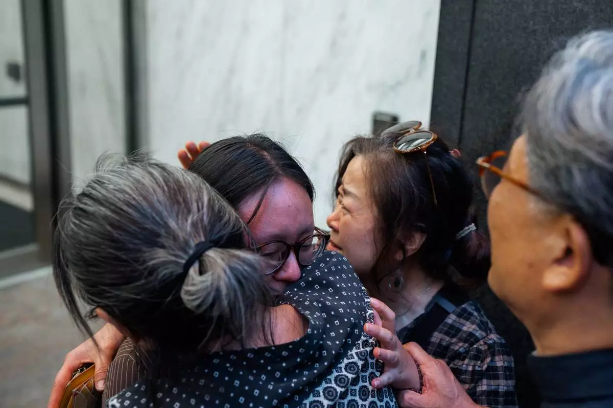 Yeonsoo Go, a Purdue student who was detained by immigration authorities in Manhattan last week, is embraced by her mother after being released from custody, Monday, Aug. 4, 2025, in New York. (AP Photo/Olga Fedorova)
