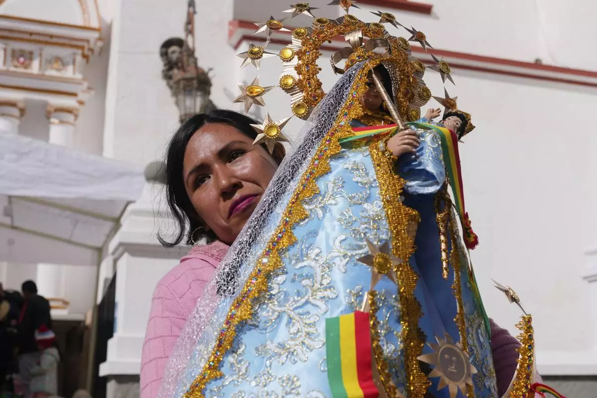 A woman holds a statue of the Virgin of Copacabana as she waits to take part in a procession honoring Bolivia's patroness, in Copacabana, Bolivia, Tuesday, Aug. 5, 2025. (AP Photo/Juan Karita)