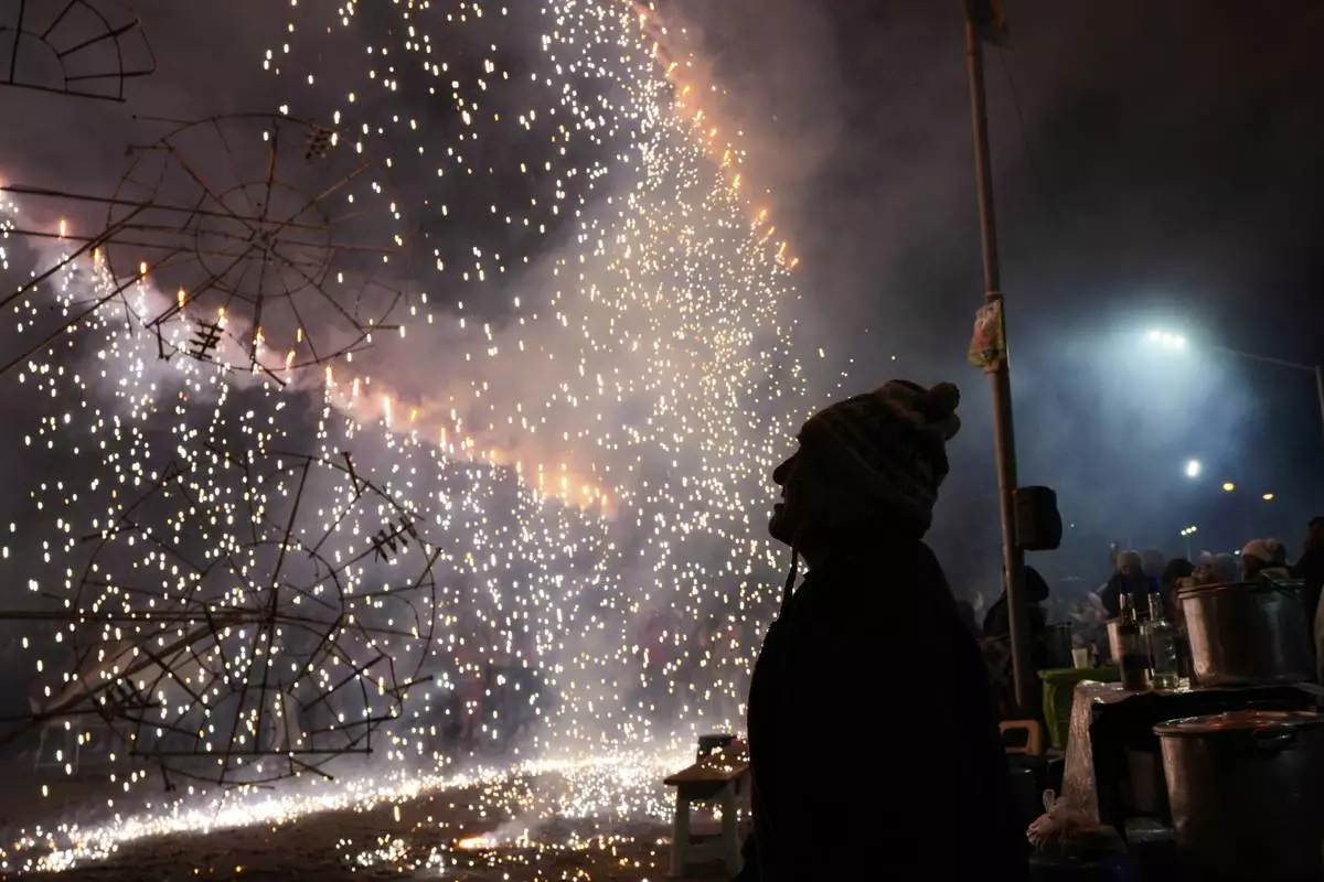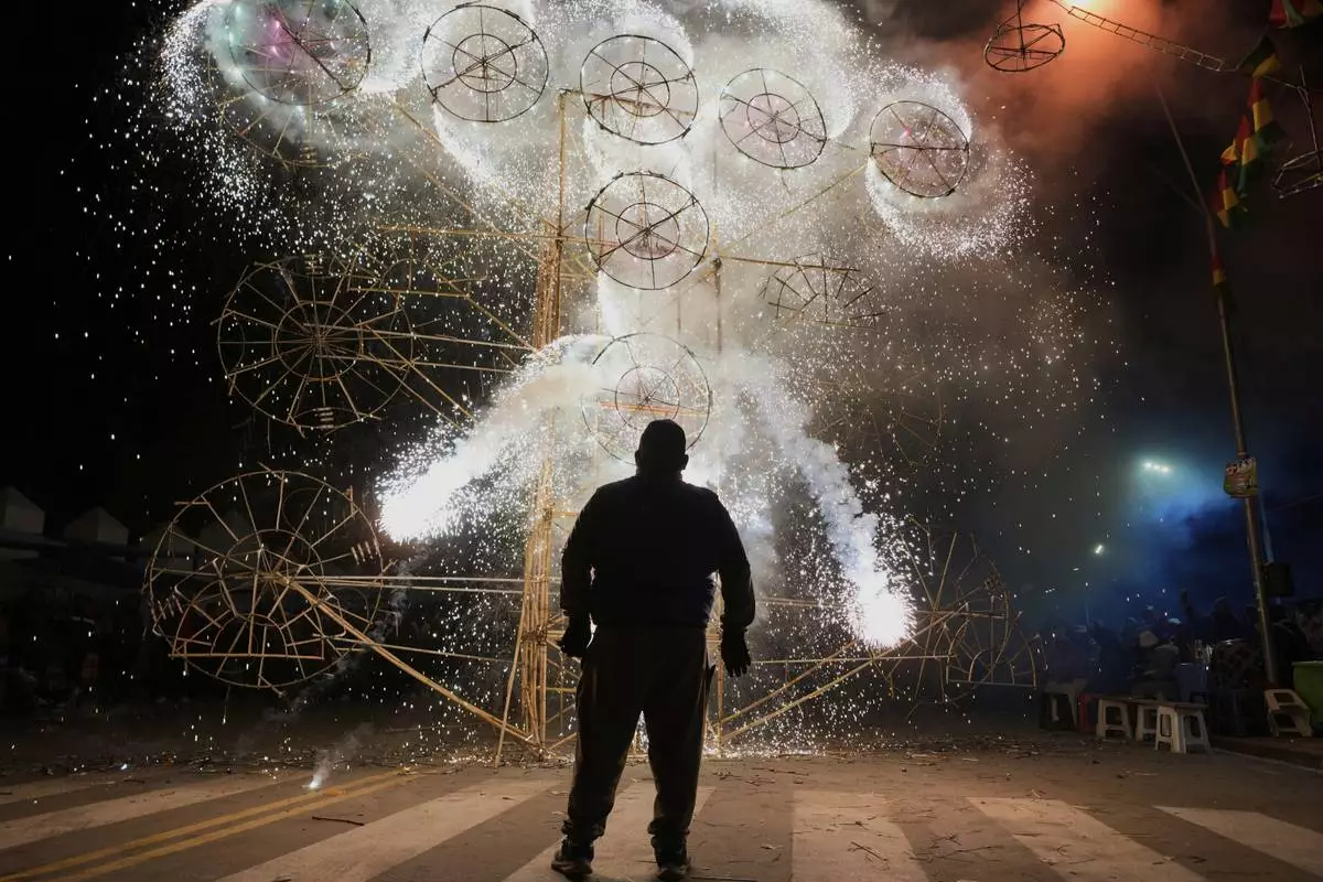 A man is silhouetted against a burst of fireworks during celebrations honoring Bolivia's patron saint, the Virgin of Copacabana, in Copacabana, Bolivia, Monday, Aug. 4, 2025. (AP Photo/Juan Karita)