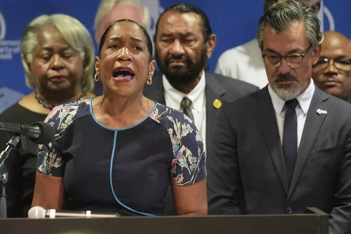 Lieutenant Governor Juliana Stratton speaks during a news conference in Aurora, Ill., on Tuesday, Aug 5, 2025. (AP Photo/Erin Hooley)