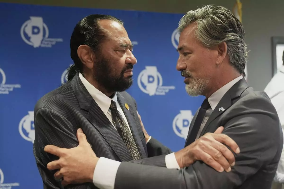 Texas Rep. Al Green, left, and State Representative Ramon Romero, Jr. talk after a news conference in Aurora, Ill., on Tuesday, Aug 5, 2025. (AP Photo/Erin Hooley)
