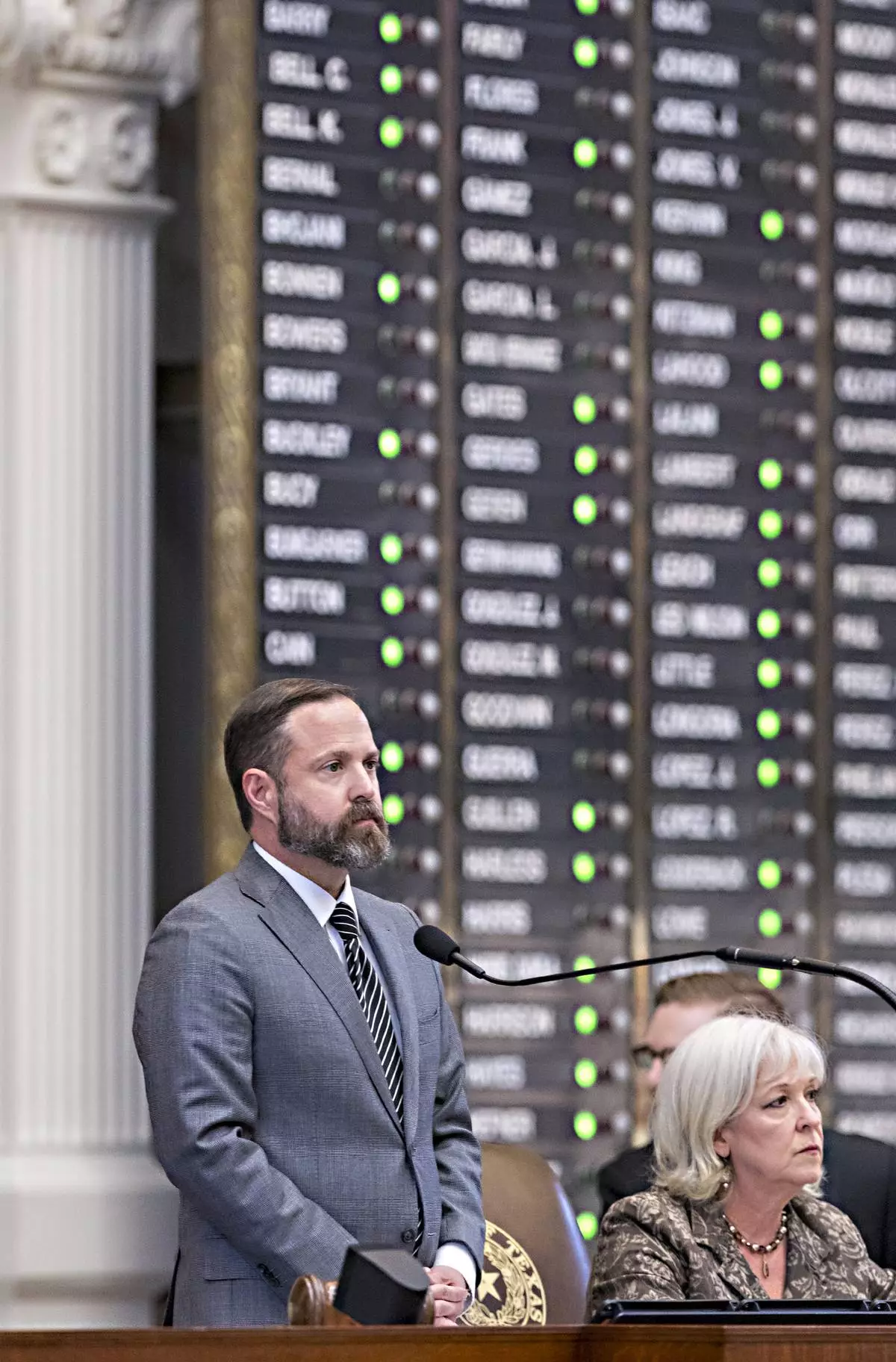 Texas House Speaker Dustin Burrows looks on during a roll call in the State Capitol, Tuesday, Aug. 5, 2025, in Austin, Texas. (AP Photo/Rodolfo Gonzalez)