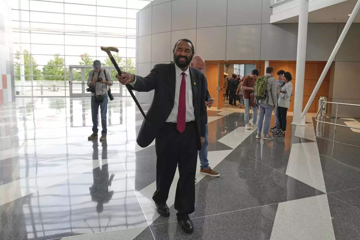 Rep. Al Green, D-Texas, leaves following a press conference with other Democratic members of Congress and Texas House Democrats at the Democratic Party in Warrenville, Ill., Monday, Aug. 4, 2025. (AP Photo/Nam Y. Huh)