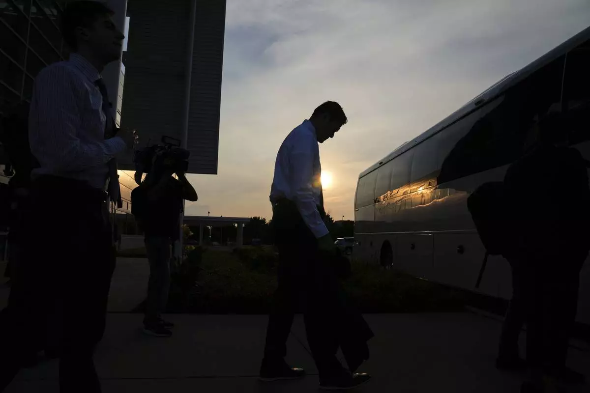 Democratic Texas Rep. Gene Wu is silhouetted by the setting sun as he boards a bus following a press conference with other Texas House Democrats and Democratic members of Congress at the Democratic Party in Warrenville, Ill., Monday, Aug. 4, 2025. (AP Photo/Nam Y. Huh)