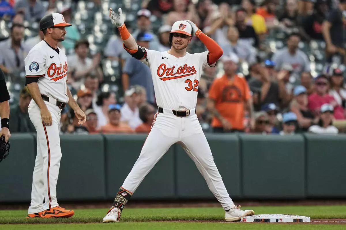 Baltimore Orioles' Ryan O'Hearn (32) celebrates after hitting an RBI triple during the fourth inning in the second baseball game of a doubleheader against the Toronto Blue Jays, Tuesday, July 29, 2025, in Baltimore. (AP Photo/Stephanie Scarbrough)