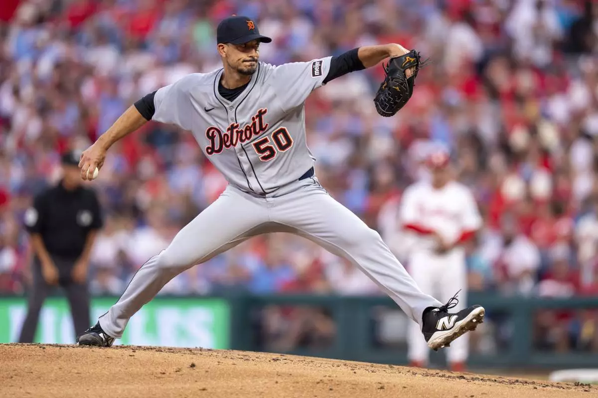 Detroit Tigers starting pitcher Charlie Morton delivers during the third inning of a baseball game against the Philadelphia Phillies, Sunday, Aug. 3, 2025, in Philadelphia. (AP Photo/Chris Szagola)