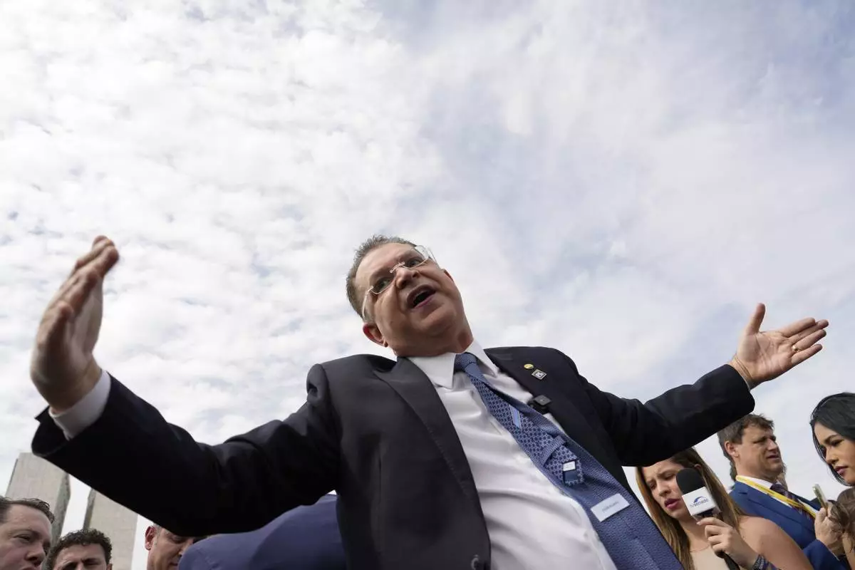 Sostenes Cavalcante, opposition leader and congressman, speaks during a press conference outside the National Congress in Brasília on Tuesday, Aug. 5, 2025, to denounce the house arrest order issued against Bolsonaro by Supreme Court Justice Alexandre de Moraes. (AP Photo/Eraldo Peres)