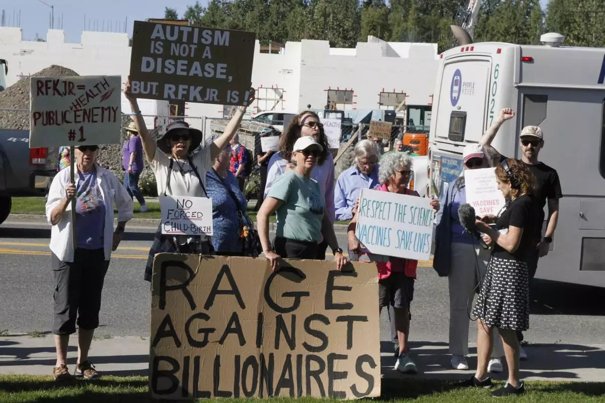 Protesters hold signs and chant outside the Alaska Native Tribal Health Consortium where U.S. Health Secretary Robert F. Kennedy Jr. met with Alaska Native leaders, in Anchorage, Alaska, Tuesday, Aug. 5, 2025, shortly after the Department of Health and Human Services announced its plans to cancel contracts and pull funding for some vaccines being developed to fight respiratory viruses like COVID-19 and the flu. (AP Photo/Mark Thiessen)