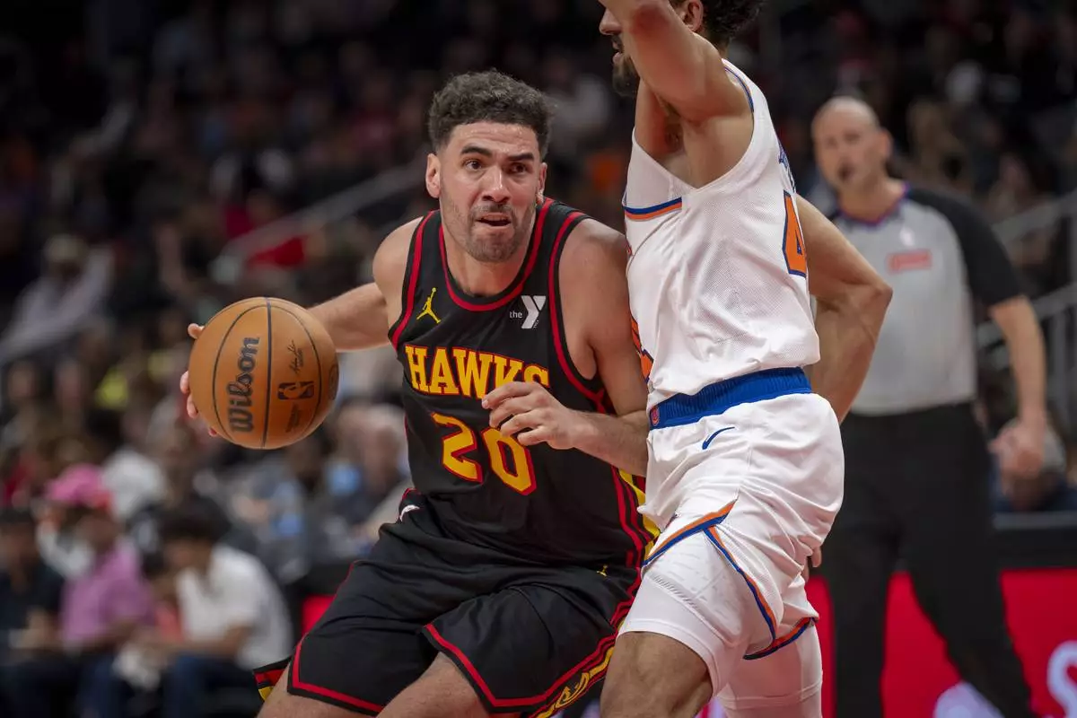 FILE - Atlanta Hawks forward Georges Niang, left, drives the ball down court against New York Knicks guard Landry Shamet, during the second half of an NBA basketball game, April 5, 2025, in Atlanta. (AP Photo/Erik Rank, File)
