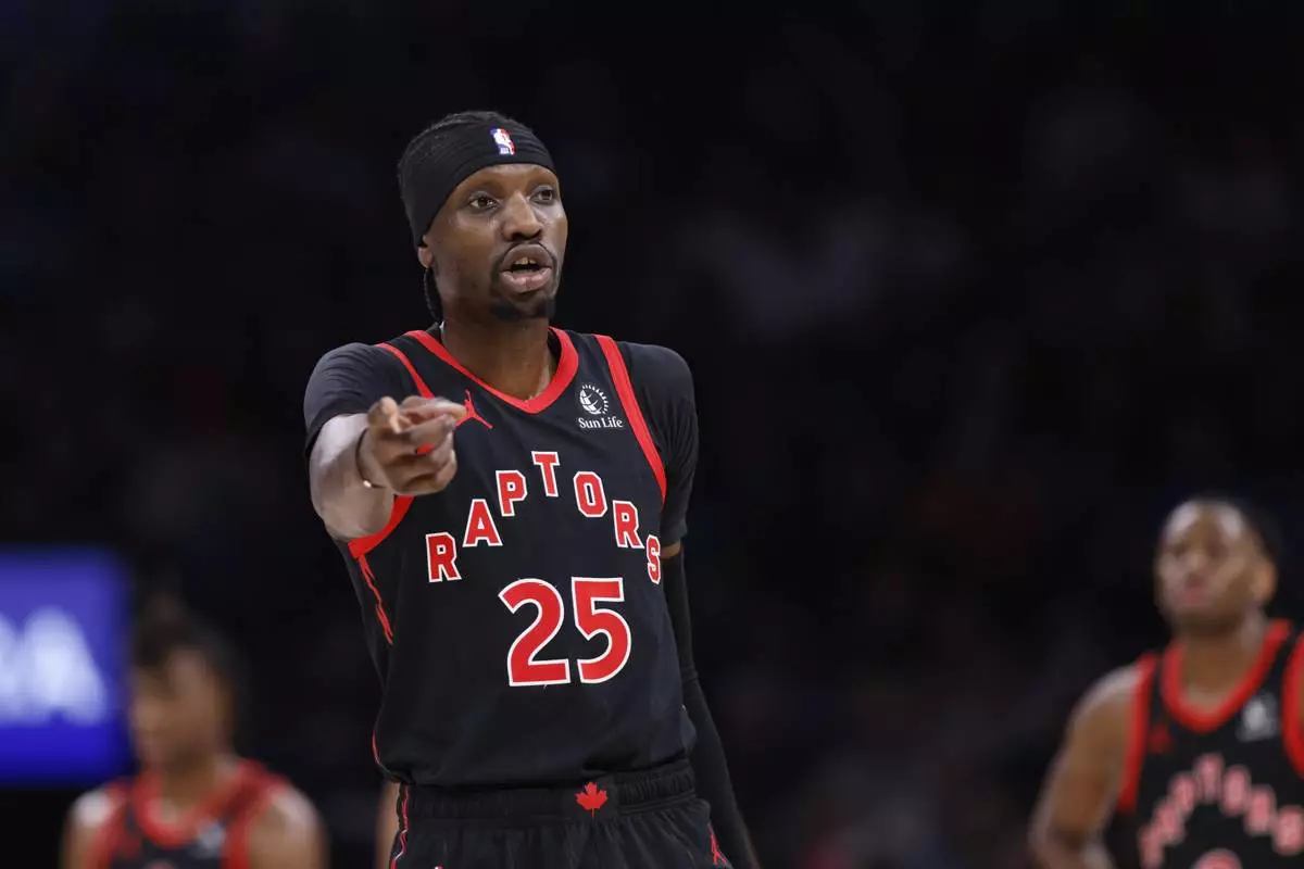 FILE - Toronto Raptors forward Chris Boucher points during the second half of an NBA basketball game against the Oklahoma City Thunder, Feb. 7, 2025, in Oklahoma City. (AP Photo/Nate Billings, File)