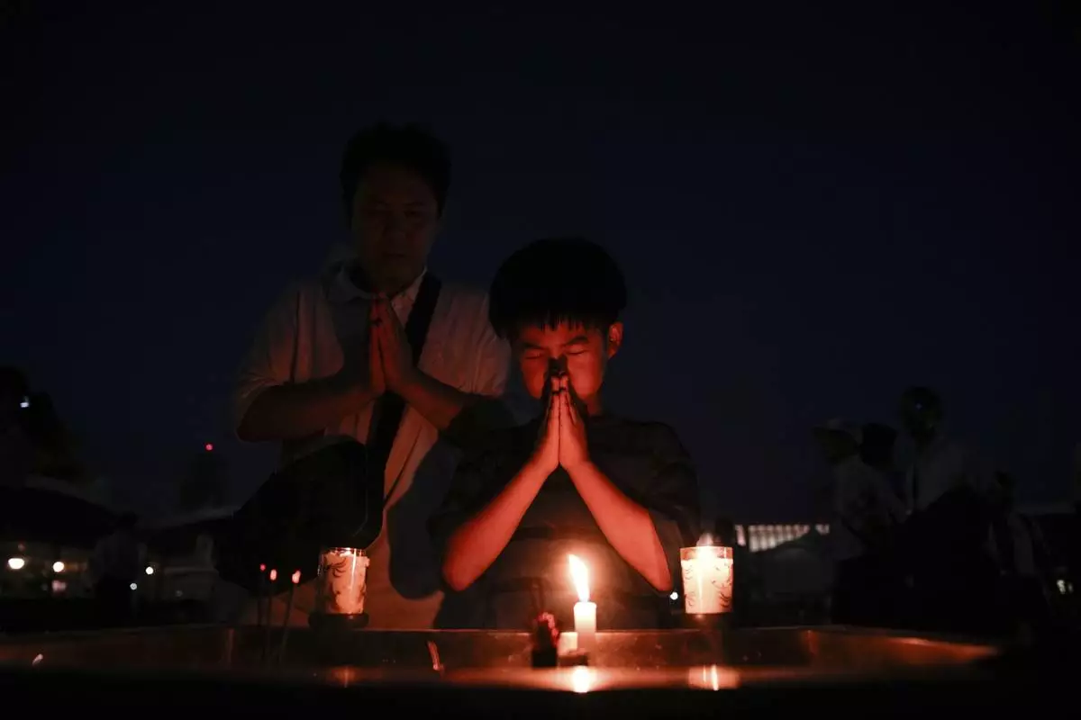 A child prays at the Peace Memorial Park ahead of the memorial service to mark the 80th anniversary of the WWII U.S. atomic bombing in Hiroshima, Wednesday, Aug. 6, 2025, in Japan. (AP Photo/Louise Delmotte)