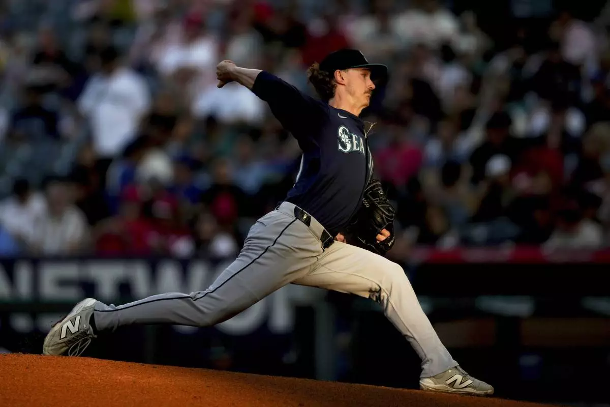 FILE - Seattle Mariners starting pitcher Bryce Miller delivers during the first inning of a baseball game against the Los Angeles Angels, June 6, 2025, in Anaheim, Calif. (AP Photo/Eric Thayer, File)