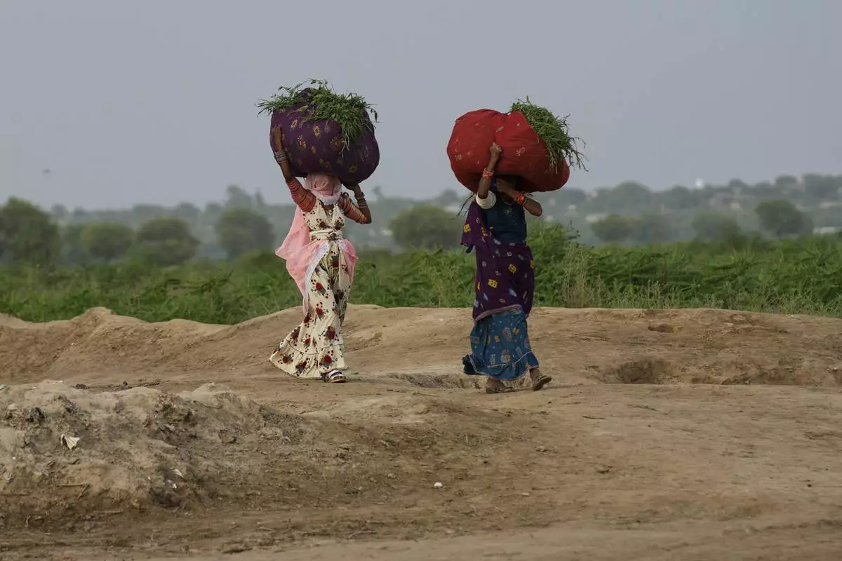 Villager women carry bundles of fodder for their livestock as they walk toward their homes at a village in Umerkot, a district of Pakistan's southeastern Sindh province, Thursday, July 17, 2025. (AP Photo/Fareed Khan)