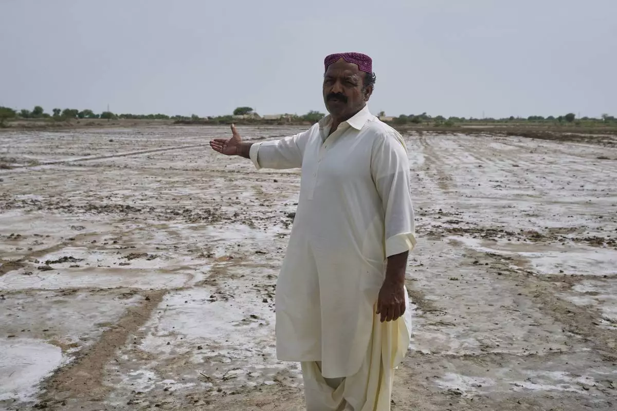 Farmer Ghulam Mustafa Mahar talks about his land, where subsoil water had risen to the surface, at a village in Umerkot, a district of Pakistan's southeastern Sindh province, Thursday, July 17, 2025. (AP Photo/Fareed Khan)