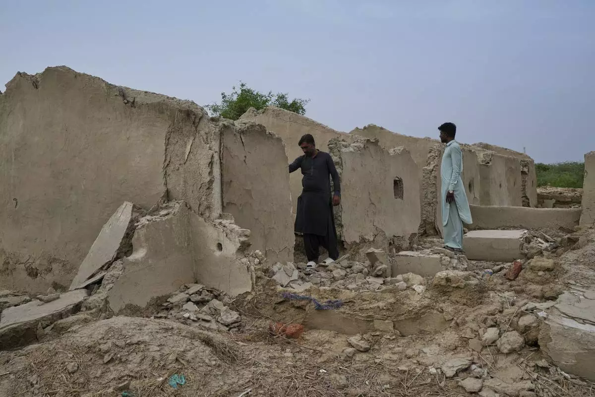 Villagers look at houses damaged by climate-induced floods several years ago at a village in Umerkot, a district of Pakistan's southeastern Sindh province, Thursday, July 17, 2025. (AP Photo/Fareed Khan)