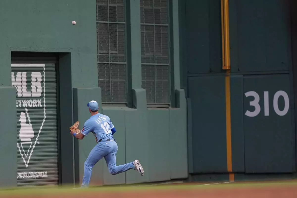 Kansas City Royals outfielder Nick Loftin fields a hit off the Green Monster in left field by Boston Red Sox Jarren Duran in the third inning of a baseball game, Tuesday, Aug. 5, 2025, in Boston. (AP Photo/Robert F. Bukaty)