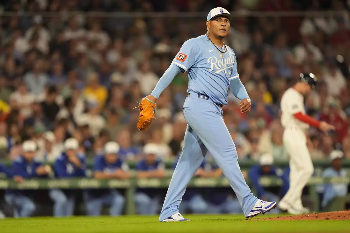 Kansas City Royals pitcher Angel Zerpa looks towards the Boston Red Sox dugout in the sixth of a baseball game, Tuesday, Aug. 5, 2025, in Boston. (AP Photo/Robert F. Bukaty)